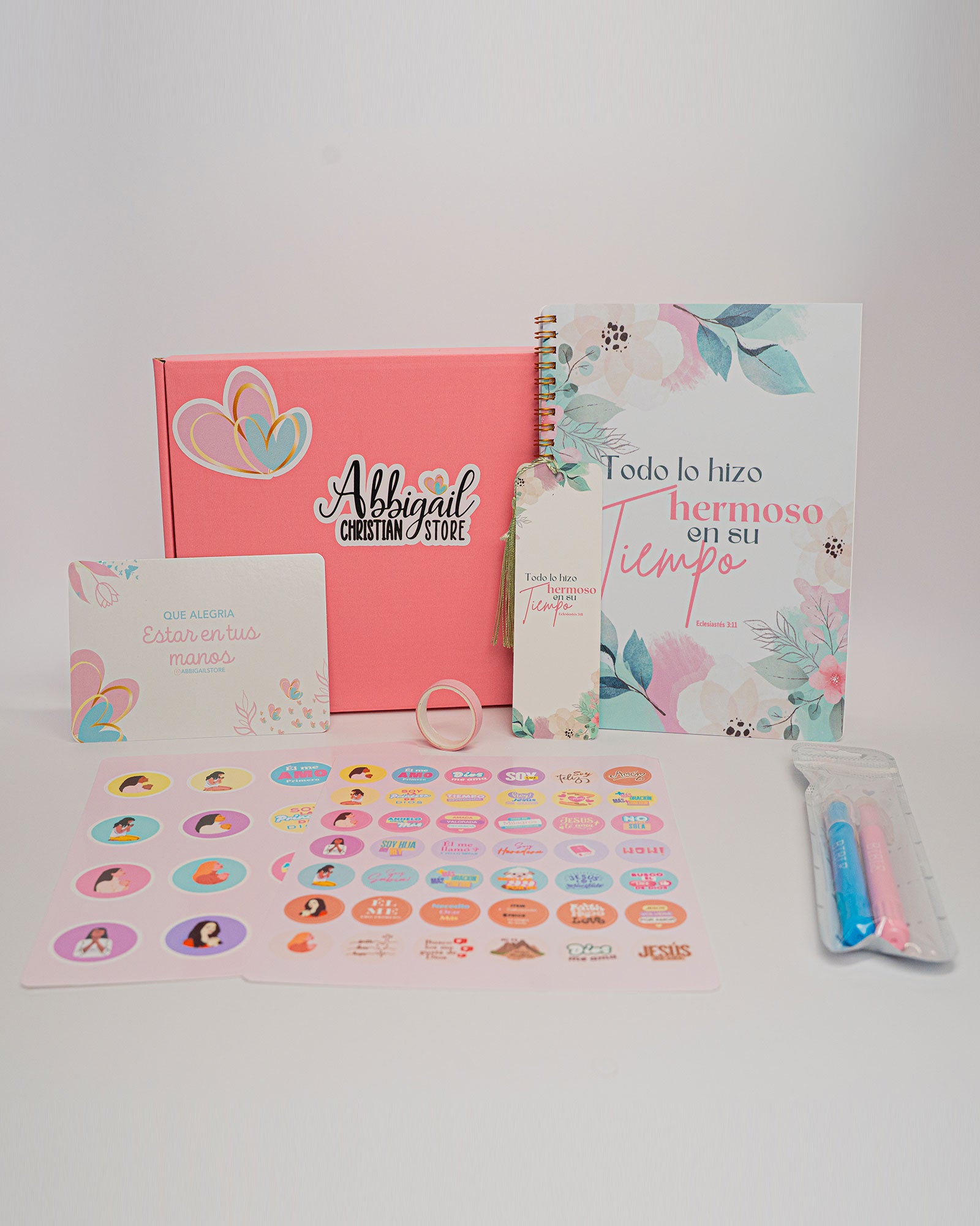 Diario Devocional + Kit de accesorios “Caja exclusiva con accesorios que complementan tu tiempo devocional: resaltadores, stickers, separadores, tarjetas bíblicas y un detalle sorpresa. Ideal para vivir tu fe con orden y belleza.”